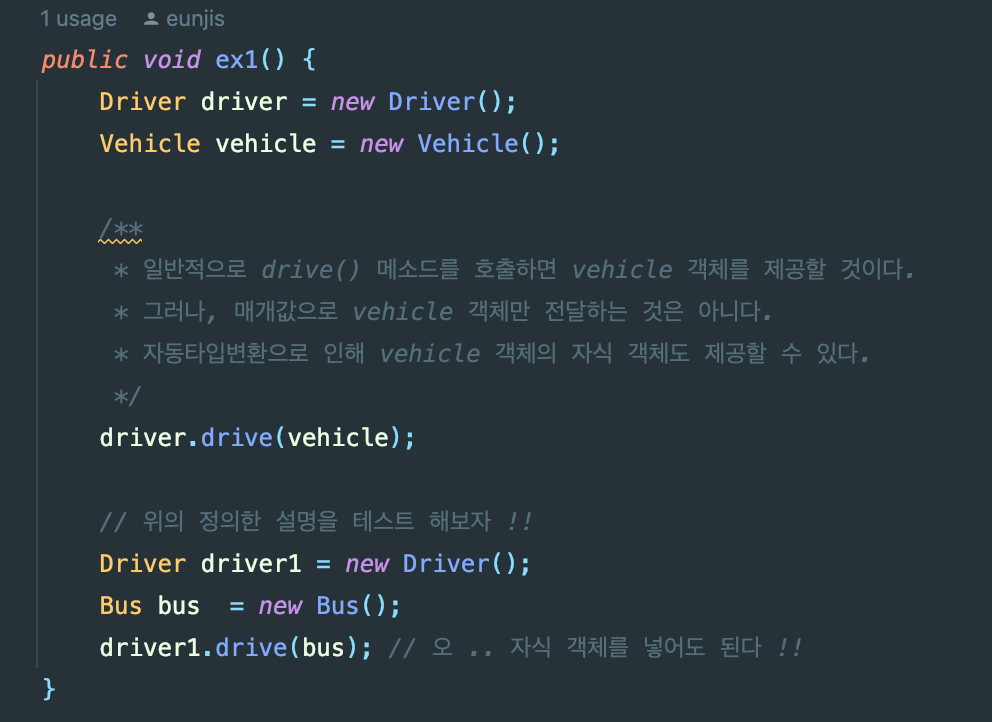🏷 상속 개념 상속은 부모가 자식에게 물려주는 행위를 말한다. 객체 지향 프로그램에서도 부모 클래스의 필드와 메소드를 자식 클래스에게 물려줄 수 있다. 상속의 장점 ! 상속은 이미 잘 개발된 클래스를 재사용하여 새로운 클래스를 만들기 때문에 중복되는 코드를 줄여 시간을 단축할 수 있다. public class A { int field1; void method1() { ... } } public class B extends A { // A 클래스 상속 String field1; void method2() { ... } } // A로부터 물려받은 필드와 메소드 B b = new B(); b.field1 = 10; b.methdo1(); // B가 추가한 필드와 메소드 b.filed2 = "홍길동"; meth..